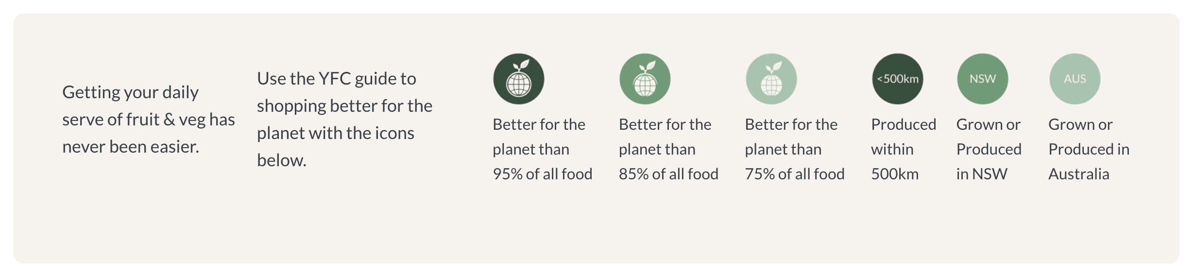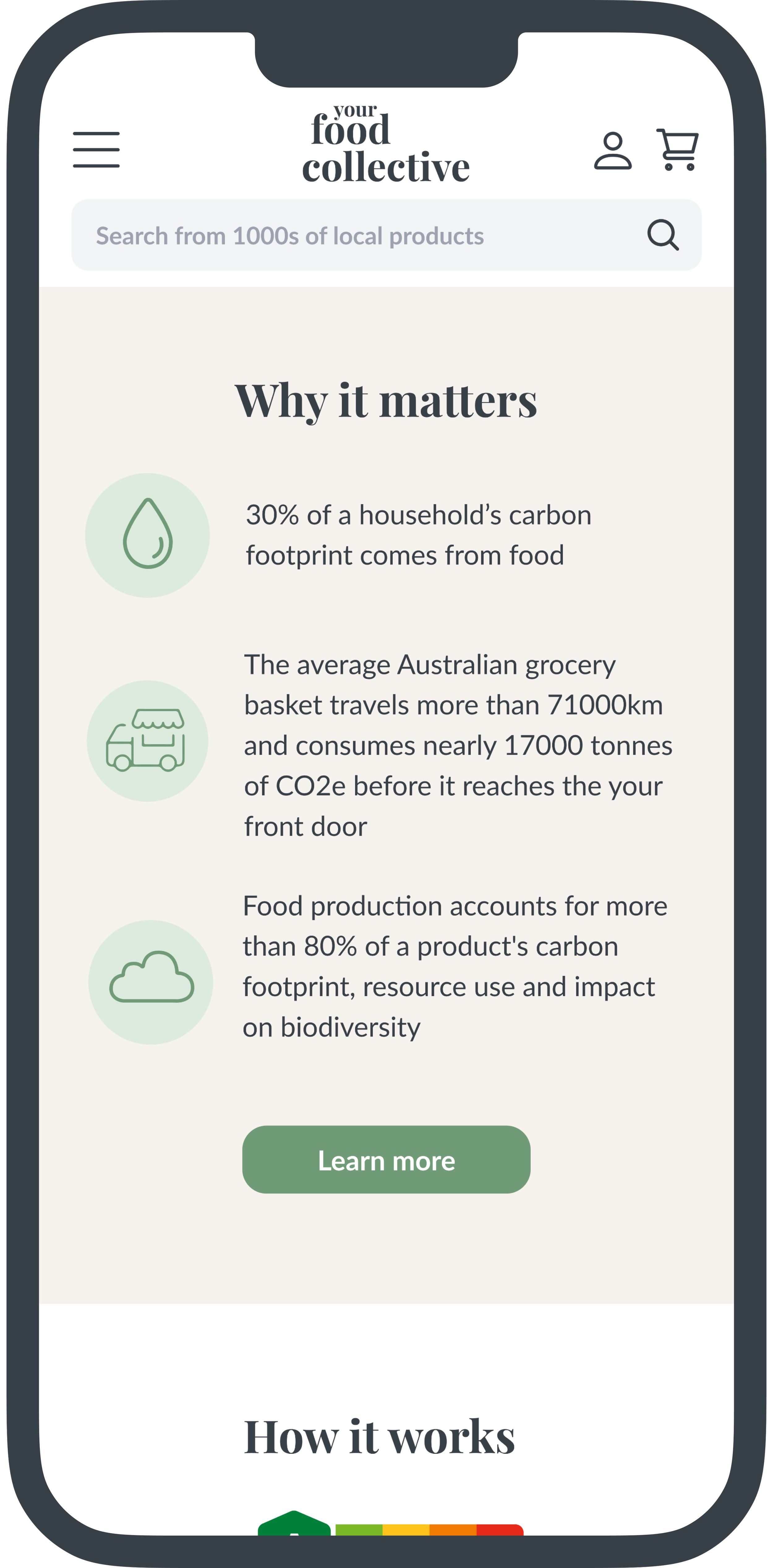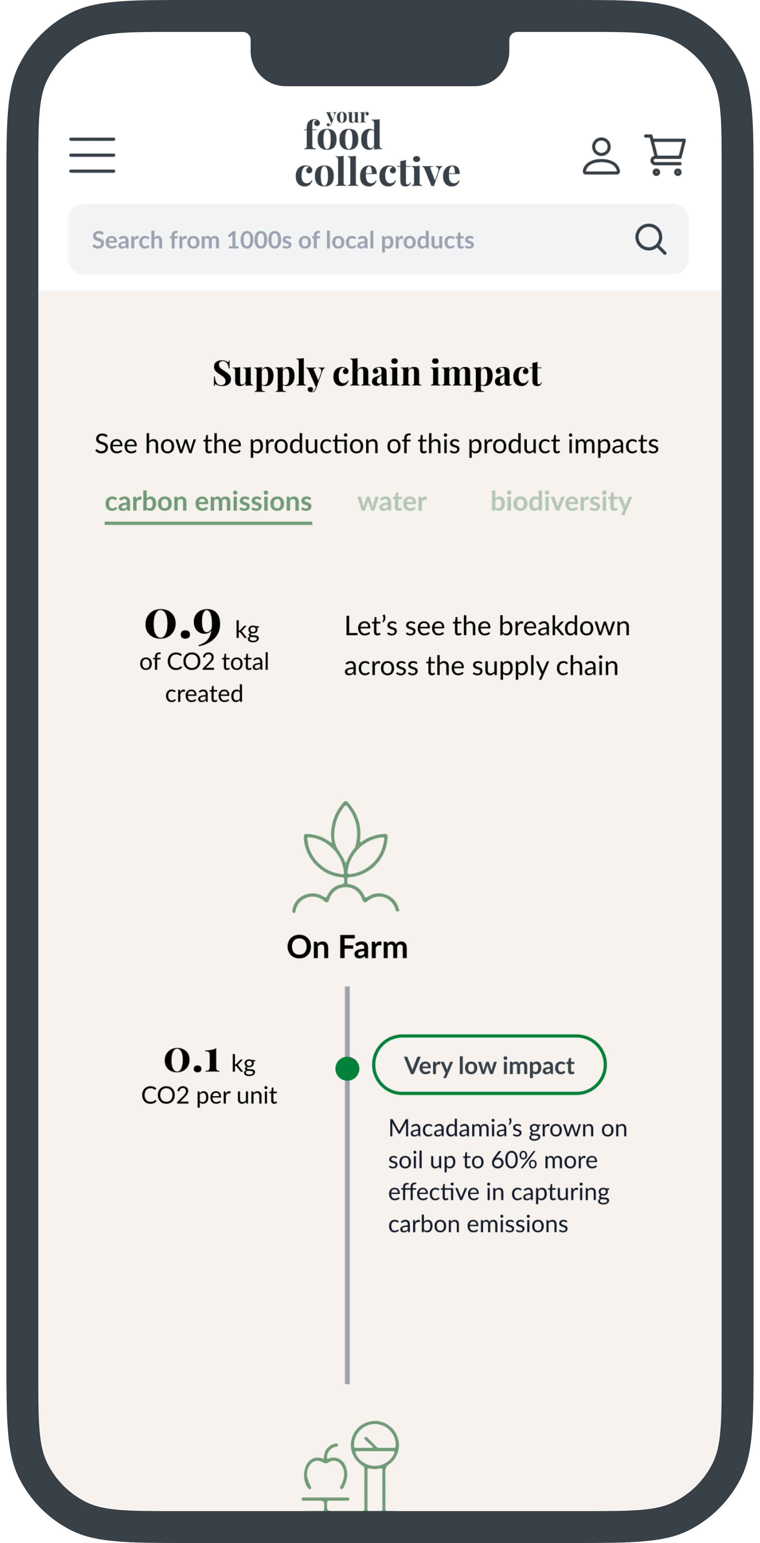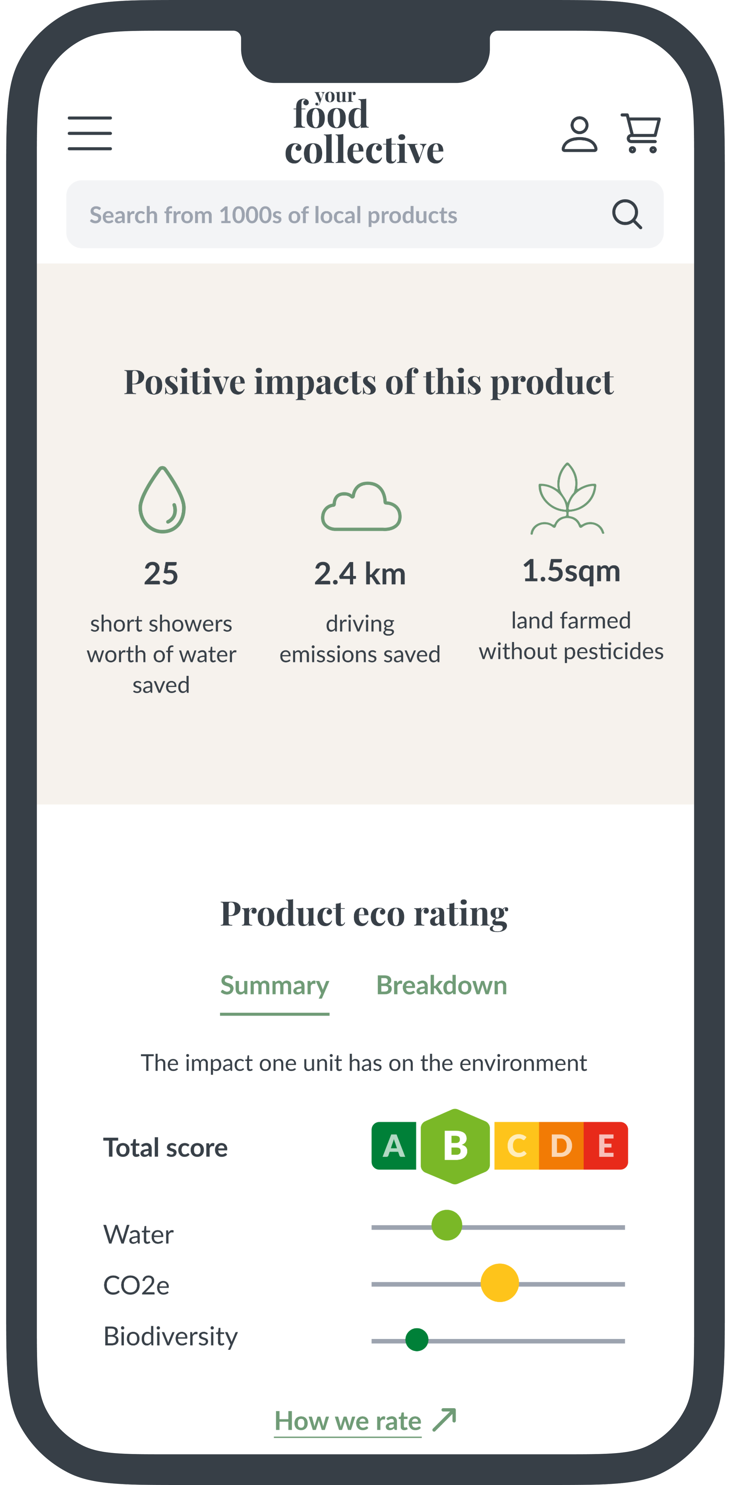 Every product page provides visibility of food production information that guides users to consider why this product might be a better choice for the planet.